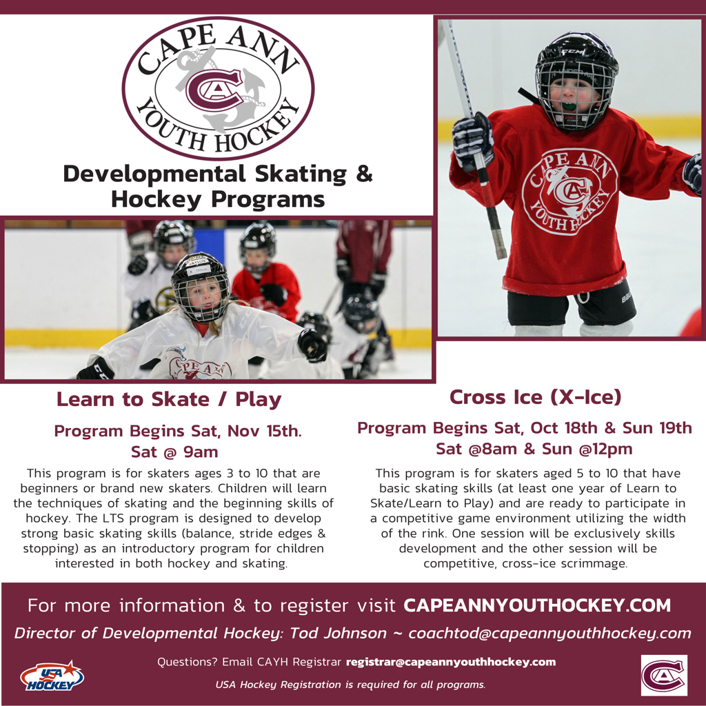 Children from the ages 3-18 can learn to skate and develop hockey skills in Cape Ann Youth Hockey's various programs. Cape Ann Youth Hockey is a non-profit organization governed by a board of directors and run by volunteers. CAYH is committed to providing our players the opportunity to have fun on the ice while learning the basic skills of ice skating and how to play the game of hockey. Most importantly, we want each and every athlete to develop friendships and have fun. We hope to develop our players to become the best hockey players that they can be and to help set good examples for them to carry into their adulthood while participating in a sport that they love to play.